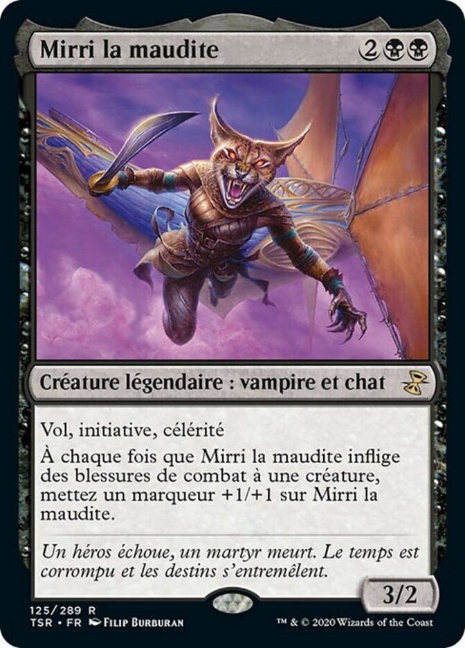 | Rules | Flying, first strike, haste Whenever Mirri the Cursed deals combat damage to a creature, put a +1/+1 counter on Mirri the Cursed. |