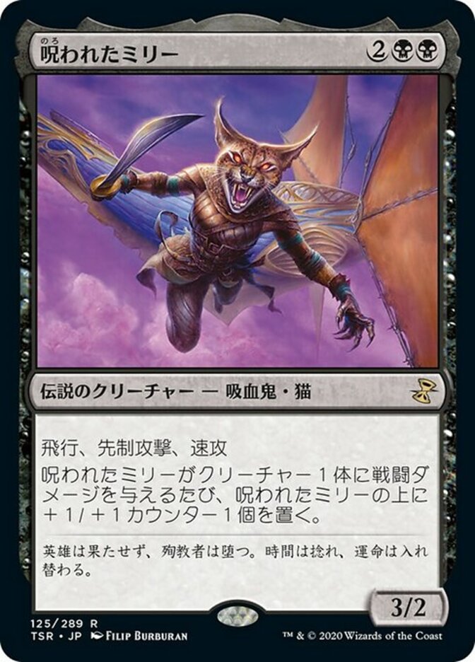 | Rules | Flying, first strike, haste Whenever Mirri the Cursed deals combat damage to a creature, put a +1/+1 counter on Mirri the Cursed. |