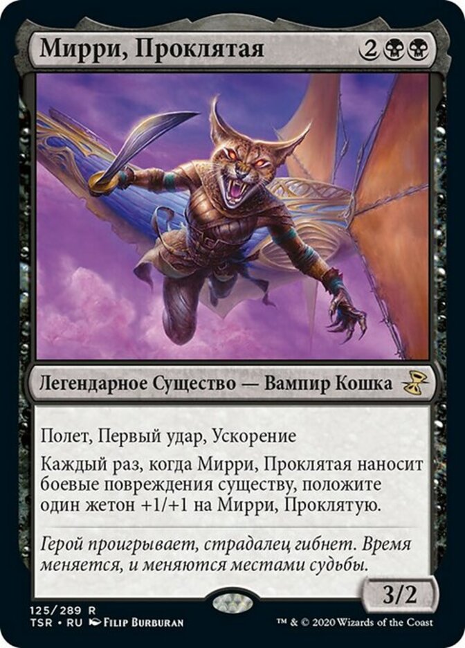 | Rules | Flying, first strike, haste Whenever Mirri the Cursed deals combat damage to a creature, put a +1/+1 counter on Mirri the Cursed. |
