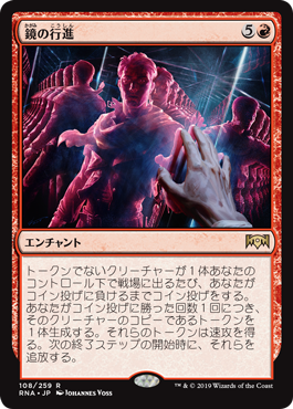 | Rules | Whenever a nontoken creature enters the battlefield under your control, flip a coin until you lose a flip. For each flip you won, create a token that's a copy of that creature. Those tokens gain haste. Exile them at the beginning of the next end step. |
