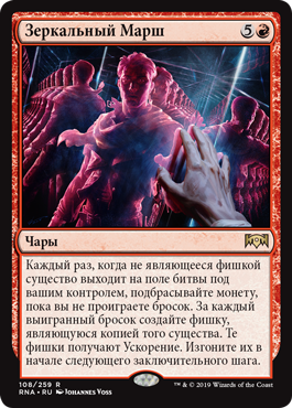 | Rules | Whenever a nontoken creature enters the battlefield under your control, flip a coin until you lose a flip. For each flip you won, create a token that's a copy of that creature. Those tokens gain haste. Exile them at the beginning of the next end step. |
