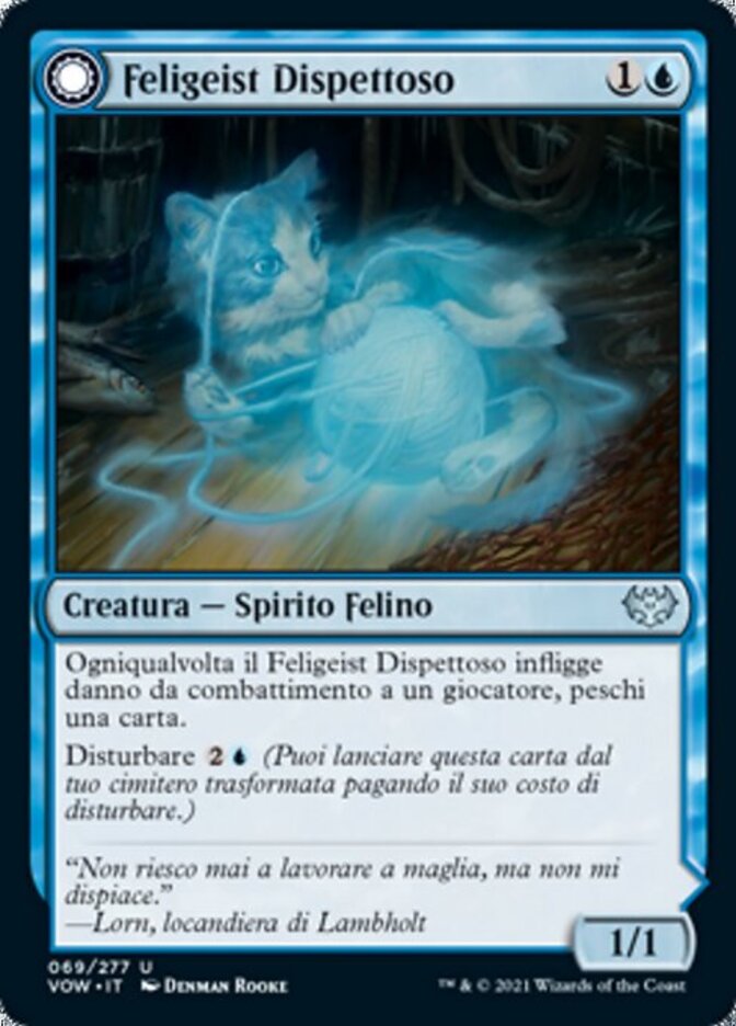 | Rules | Whenever Mischievous Catgeist deals combat damage to a player, draw a card. Disturb (You may cast this card from your graveyard transformed for its disturb cost.) // Enchant creature Enchanted creature has "Whenever this creature deals combat damage to a player, draw a card." If Catlike Curiosity would be put into a graveyard from anywhere, exile it instead. |