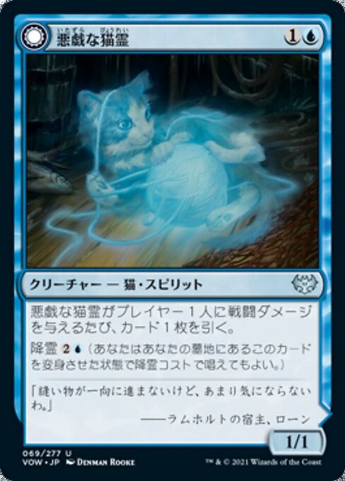 | Rules | Whenever Mischievous Catgeist deals combat damage to a player, draw a card. Disturb (You may cast this card from your graveyard transformed for its disturb cost.) // Enchant creature Enchanted creature has "Whenever this creature deals combat damage to a player, draw a card." If Catlike Curiosity would be put into a graveyard from anywhere, exile it instead. |