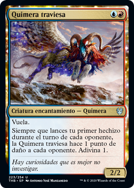 | Rules | Flying Whenever you cast your first spell during each opponent's turn, Mischievous Chimera deals 1 damage to each opponent. Scry 1. |