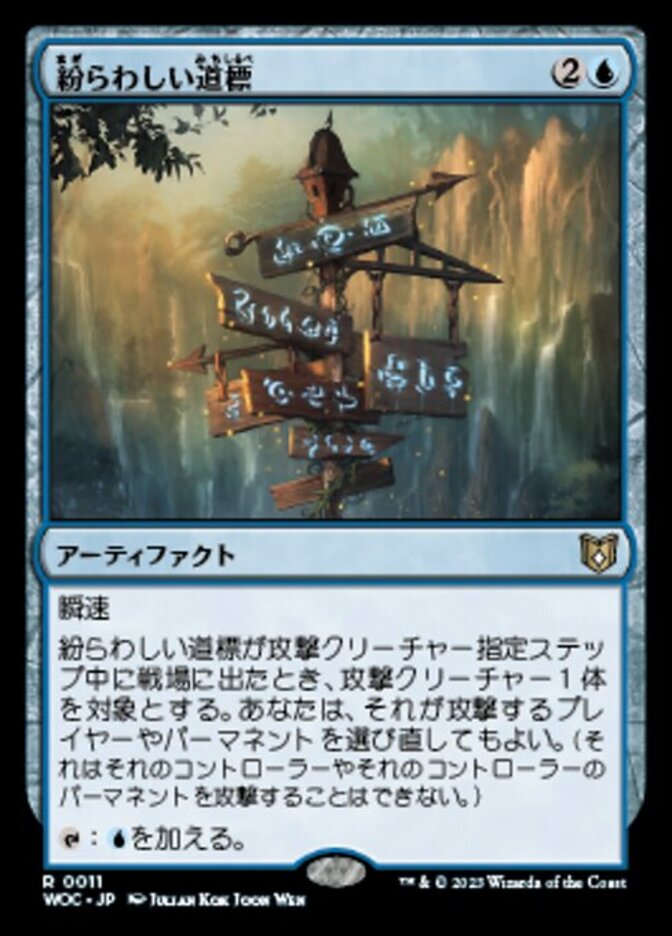 | Rules | Flash When Misleading Signpost enters the battlefield during the declare attackers step, you may reselect which player or permanent target attacking creature is attacking. (It can't attack its controller or their permanents.) : Add . |