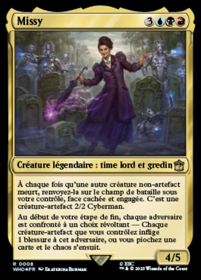 | Rules | Whenever another nonartifact creature dies, return it to the battlefield under your control face down and tapped. It's a 2/2 Cyberman artifact creature. At the beginning of your end step, each opponent faces a villainous choice — Each artifact creature you control deals 1 damage to that opponent, or you draw a card and chaos ensues. |