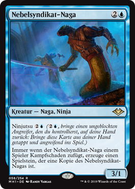 | Rules | Ninjutsu (, Return an unblocked attacker you control to hand: Put this card onto the battlefield from your hand tapped and attacking.) Whenever Mist-Syndicate Naga deals combat damage to a player, create a token that's a copy of Mist-Syndicate Naga. |