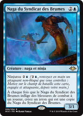 | Rules | Ninjutsu (, Return an unblocked attacker you control to hand: Put this card onto the battlefield from your hand tapped and attacking.) Whenever Mist-Syndicate Naga deals combat damage to a player, create a token that's a copy of Mist-Syndicate Naga. |