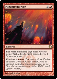 | Rules | Mizzium Mortars deals 4 damage to target creature you don't control. Overload (You may cast this spell for its overload cost. If you do, change its text by replacing all instances of "target" with "each.") |