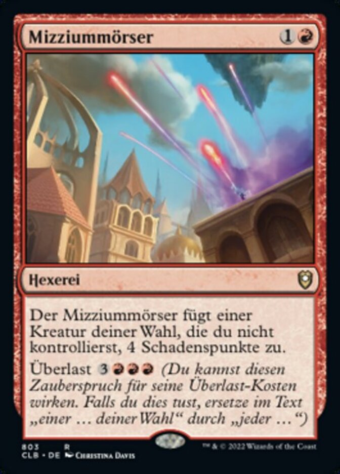| Rules | Mizzium Mortars deals 4 damage to target creature you don't control. Overload (You may cast this spell for its overload cost. If you do, change its text by replacing all instances of "target" with "each.") |