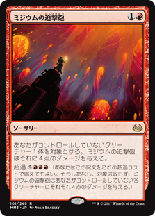 | Rules | Mizzium Mortars deals 4 damage to target creature you don't control. Overload (You may cast this spell for its overload cost. If you do, change its text by replacing all instances of "target" with "each.") |