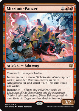 | Rules | Trample Whenever you cast a noncreature spell, Mizzium Tank becomes an artifact creature and gets +1/+1 until end of turn. Crew 1 (Tap any number of creatures you control with total power 1 or more: This Vehicle becomes an artifact creature until end of turn.) |