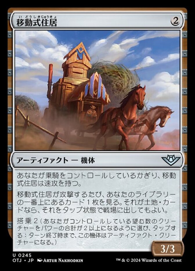 | Rules | Mobile Homestead has haste as long as you control a Mount. Whenever Mobile Homestead attacks, look at the top card of your library. If it's a land card, you may put it onto the battlefield tapped. Crew 2 (Tap any number of creatures you control with total power 2 or more: This Vehicle becomes an artifact creature until end of turn.) |