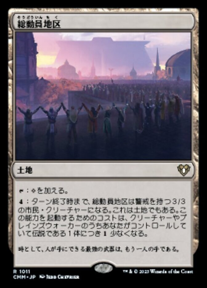 | Rules | : Add . : Mobilized District becomes a 3/3 Citizen creature with vigilance until end of turn. It's still a land. This ability costs less to activate for each legendary creature and planeswalker you control. |