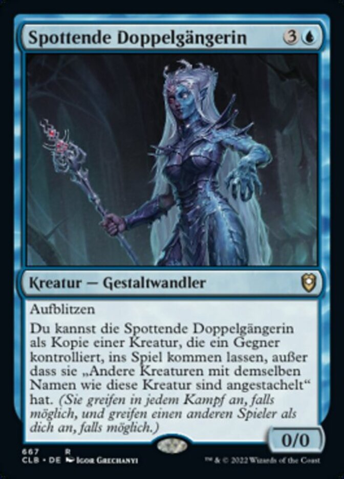 | Rules | Flash You may have Mocking Doppelganger enter the battlefield as a copy of a creature an opponent controls, except it has "Other creatures with the same name as this creature are goaded." (They attack each combat if able and attack a player other than you if able.) |