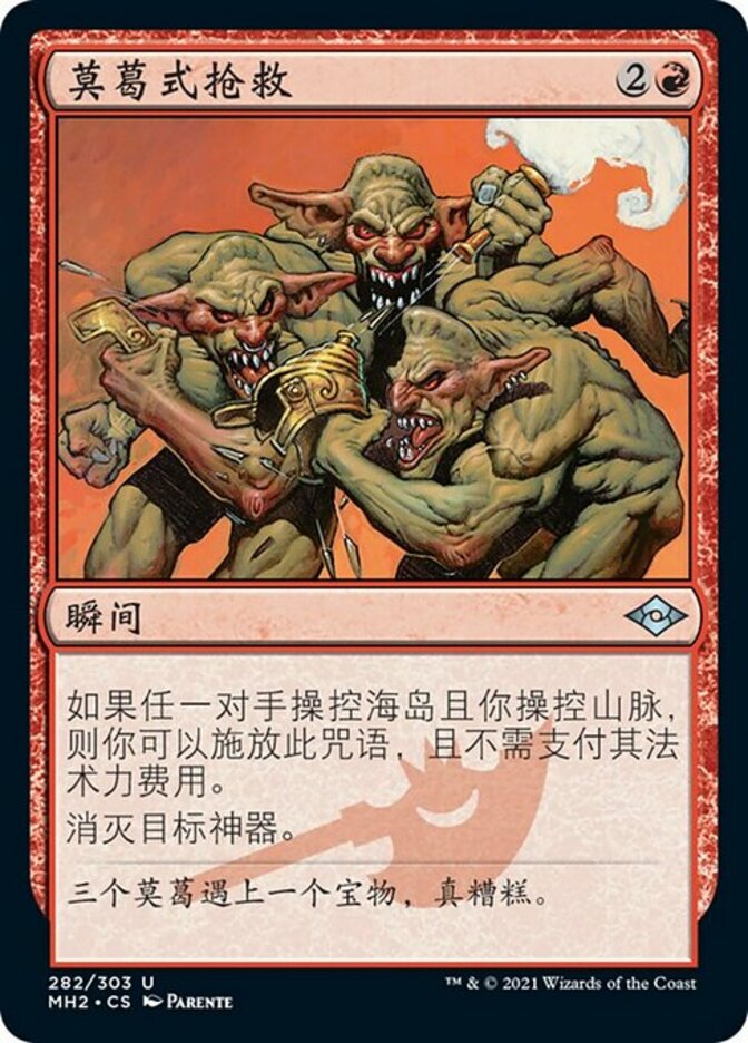 | Rules | If an opponent controls an Island and you control a Mountain, you may cast this spell without paying its mana cost. Destroy target artifact. |