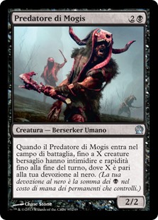 | Rules | When Mogis's Marauder enters the battlefield, up to X target creatures each gain intimidate and haste until end of turn, where X is your devotion to black. (A creature with intimidate can't be blocked except by artifact creatures and/or creatures that share a color with it. Each in the mana costs of permanents you control counts toward your devotion to black.) |