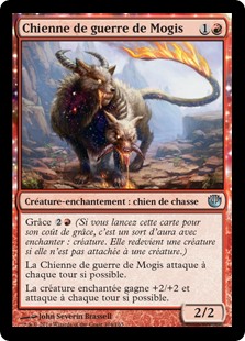 | Rules | Bestow (If you cast this card for its bestow cost, it's an Aura spell with enchant creature. It becomes a creature again if it's not attached to a creature.) Mogis's Warhound attacks each combat if able. Enchanted creature gets +2/+2 and attacks each combat if able. |