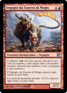 | Rules | Bestow (If you cast this card for its bestow cost, it's an Aura spell with enchant creature. It becomes a creature again if it's not attached to a creature.) Mogis's Warhound attacks each combat if able. Enchanted creature gets +2/+2 and attacks each combat if able. |