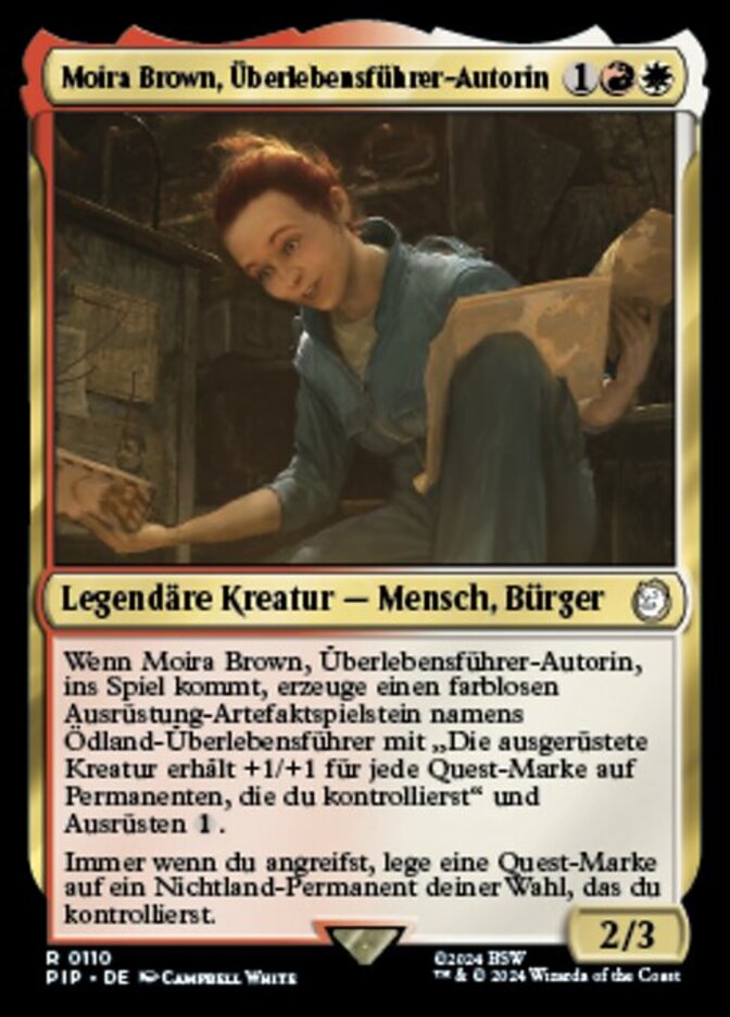 | Rules | When Moira Brown, Guide Author enters the battlefield, create a colorless Equipment artifact token named Wasteland Survival Guide with "Equipped creature gets +1/+1 for each quest counter among permanents you control" and equip . Whenever you attack, put a quest counter on target nonland permanent you control. |
