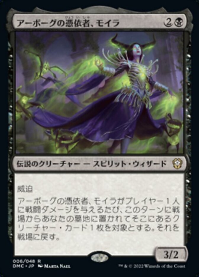 | Rules | Menace Whenever Moira, Urborg Haunt deals combat damage to a player, return to the battlefield target creature card in your graveyard that was put there from the battlefield this turn. |