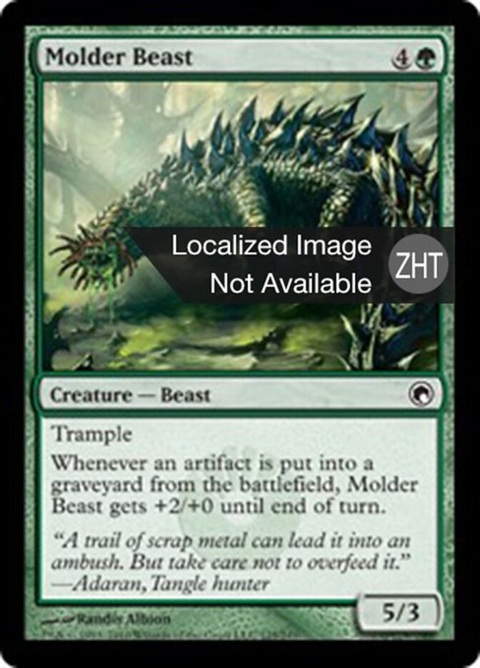 | Rules | Trample Whenever an artifact is put into a graveyard from the battlefield, Molder Beast gets +2/+0 until end of turn. |