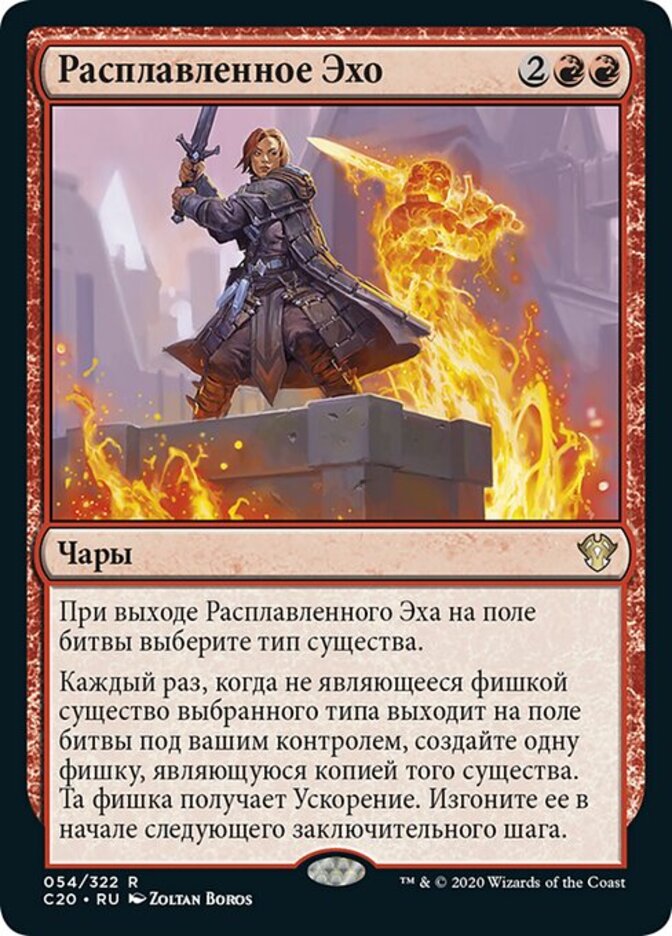 | Rules | As Molten Echoes enters the battlefield, choose a creature type. Whenever a nontoken creature of the chosen type enters the battlefield under your control, create a token that's a copy of that creature. That token gains haste. Exile it at the beginning of the next end step. |