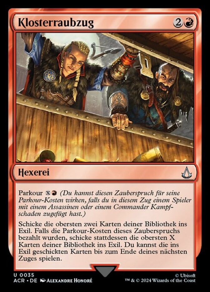 | Rules | Freerunning (You may cast this spell for its freerunning cost if you dealt combat damage to a player this turn with an Assassin or commander.) Exile the top two cards of your library. If this spell's freerunning cost was paid, exile the top X cards of your library instead. You may play the exiled cards until the end of your next turn. |