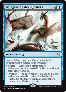 | Rules | As Monastery Siege enters the battlefield, choose Khans or Dragons. • Khans — At the beginning of your draw step, draw an additional card, then discard a card. • Dragons — Spells your opponents cast that target you or a permanent you control cost more to cast. |