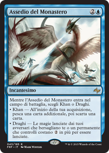 | Rules | As Monastery Siege enters the battlefield, choose Khans or Dragons. • Khans — At the beginning of your draw step, draw an additional card, then discard a card. • Dragons — Spells your opponents cast that target you or a permanent you control cost more to cast. |