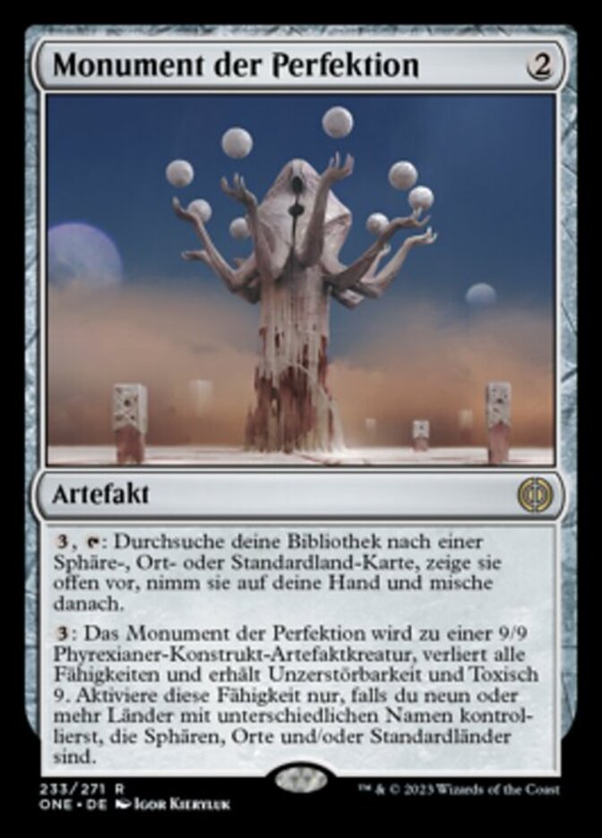| Rules | , : Search your library for a basic, Sphere, or Locus land card, reveal it, put it into your hand, then shuffle. : Monument to Perfection becomes a 9/9 Phyrexian Construct artifact creature, loses all abilities, and gains indestructible and toxic 9. Activate only if there are nine or more lands with different names among the basic, Sphere, and Locus lands you control. |