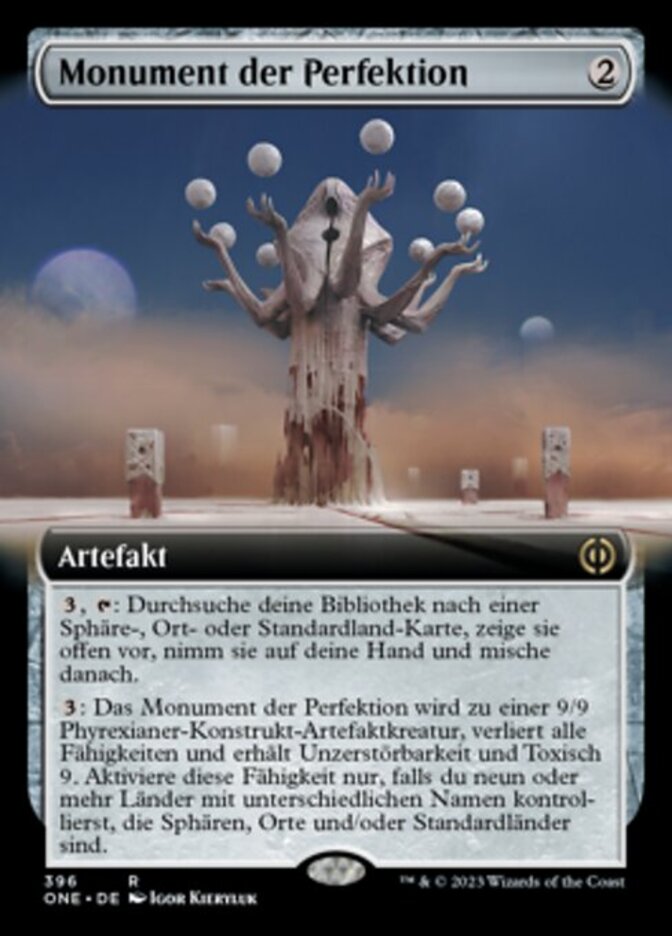 | Rules | , : Search your library for a basic, Sphere, or Locus land card, reveal it, put it into your hand, then shuffle. : Monument to Perfection becomes a 9/9 Phyrexian Construct artifact creature, loses all abilities, and gains indestructible and toxic 9. Activate only if there are nine or more lands with different names among the basic, Sphere, and Locus lands you control. |