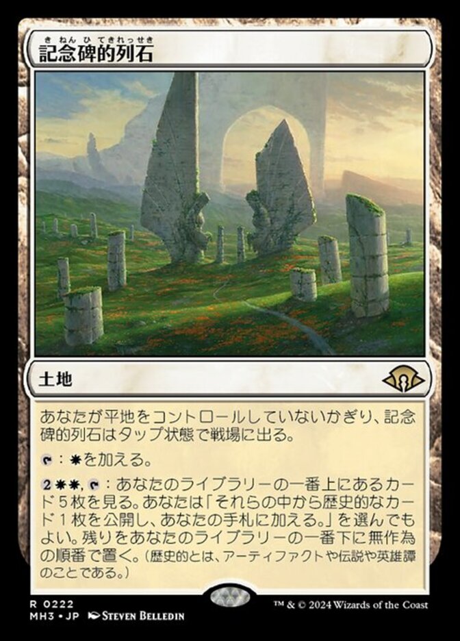 | Rules | Monumental Henge enters the battlefield tapped unless you control a Plains. : Add . , : Look at the top five cards of your library. You may reveal a historic card from among them and put it into your hand. Put the rest on the bottom of your library in a random order. |