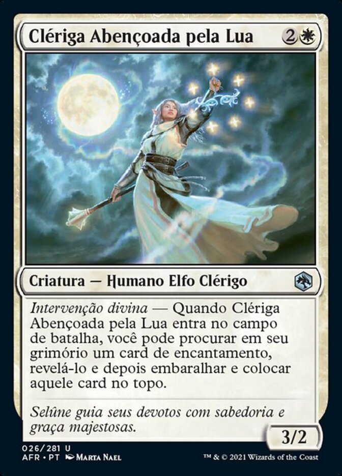 | Rules | Divine Intervention — When Moon-Blessed Cleric enters the battlefield, you may search your library for an enchantment card, reveal it, then shuffle and put that card on top. |