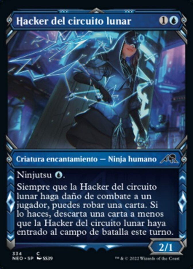 | Rules | Ninjutsu (, Return an unblocked attacker you control to hand: Put this card onto the battlefield from your hand tapped and attacking.) Whenever Moon-Circuit Hacker deals combat damage to a player, you may draw a card. If you do, discard a card unless Moon-Circuit Hacker entered the battlefield this turn. |