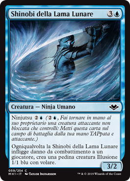 | Rules | Ninjutsu (, Return an unblocked attacker you control to hand: Put this card onto the battlefield from your hand tapped and attacking.) Whenever Moonblade Shinobi deals combat damage to a player, create a 1/1 blue Illusion creature token with flying. |