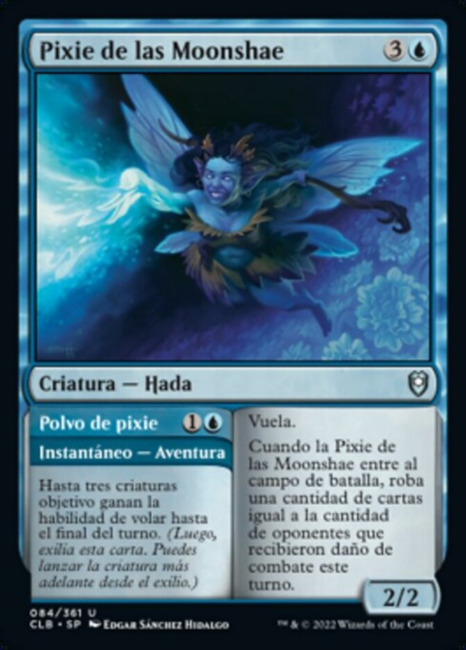 | Rules | Flying When Moonshae Pixie enters the battlefield, draw cards equal to the number of opponents who were dealt combat damage this turn. // Up to three target creatures gain flying until end of turn. (Then exile this card. You may cast the creature later from exile.) |
