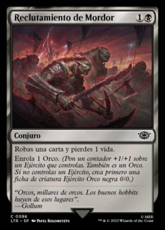 | Rules | You draw a card and you lose 1 life. Amass Orcs 1. (Put a +1/+1 counter on an Army you control. It's also an Orc. If you don't control an Army, create a 0/0 black Orc Army creature token first.) |
