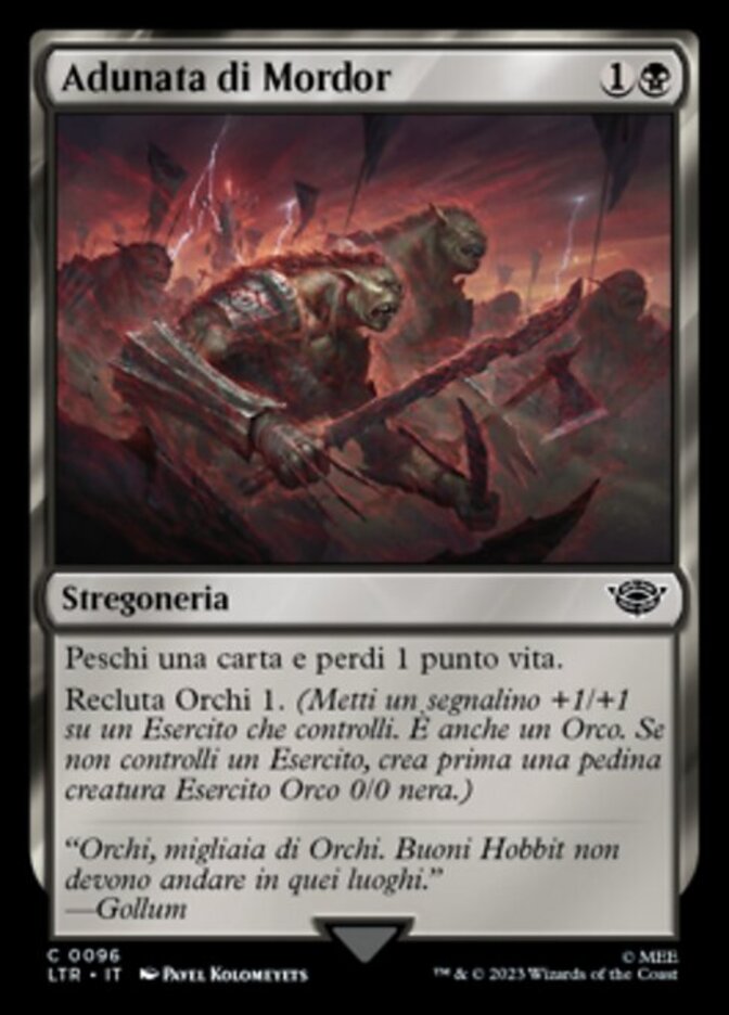 | Rules | You draw a card and you lose 1 life. Amass Orcs 1. (Put a +1/+1 counter on an Army you control. It's also an Orc. If you don't control an Army, create a 0/0 black Orc Army creature token first.) |