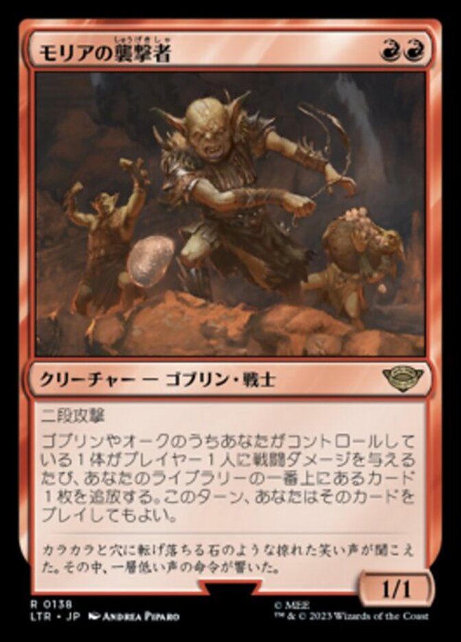 | Rules | Double strike Whenever a Goblin or Orc you control deals combat damage to a player, exile the top card of your library. You may play that card this turn. |
