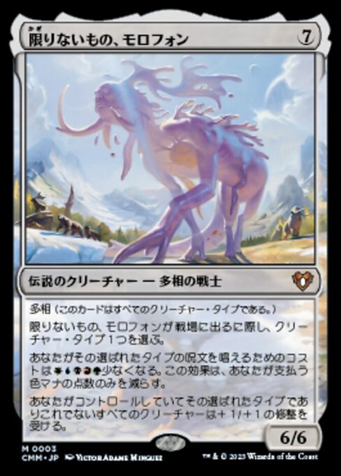 | Rules | Changeling (This card is every creature type.) As Morophon, the Boundless enters the battlefield, choose a creature type. Spells of the chosen type you cast cost less to cast. This effect reduces only the amount of colored mana you pay. Other creatures you control of the chosen type get +1/+1. |