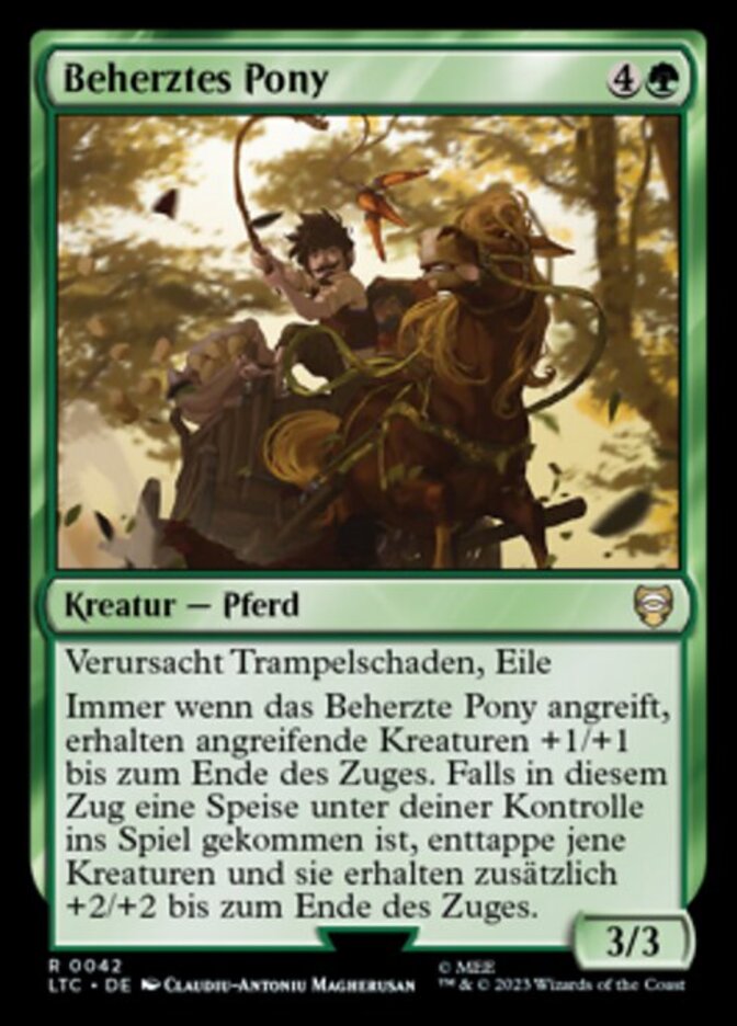 | Rules | Trample, haste Whenever Motivated Pony attacks, attacking creatures get +1/+1 until end of turn. If a Food entered the battlefield under your control this turn, untap those creatures and they get an additional +2/+2 until end of turn. |