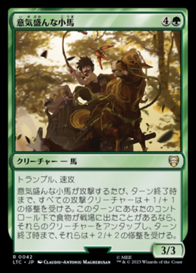 Whenever Motivated Pony attacks, attacking creatures get +1/+1 until end of turn. If a Food entered the battlefield under your control this turn, untap those creatures and they get an additional +2/+2 until end of turn.