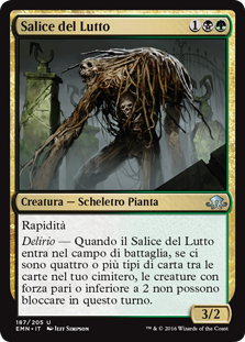 | Rules | Haste Delirium — When Mournwillow enters the battlefield, if there are four or more card types among cards in your graveyard, creatures with power 2 or less can't block this turn. |