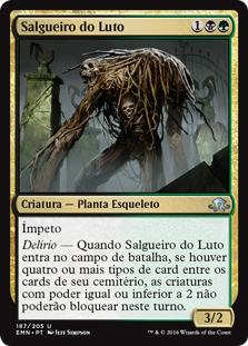 | Rules | Haste Delirium — When Mournwillow enters the battlefield, if there are four or more card types among cards in your graveyard, creatures with power 2 or less can't block this turn. |