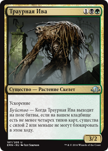| Rules | Haste Delirium — When Mournwillow enters the battlefield, if there are four or more card types among cards in your graveyard, creatures with power 2 or less can't block this turn. |