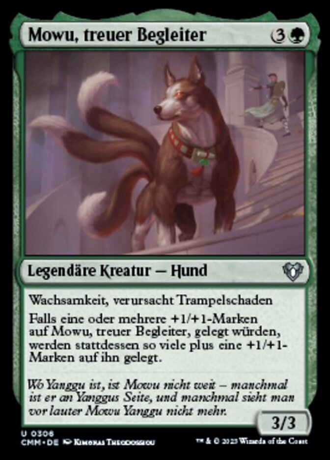 | Rules | Vigilance, trample If one or more +1/+1 counters would be put on Mowu, Loyal Companion, that many plus one +1/+1 counters are put on it instead. |
