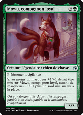 | Rules | Vigilance, trample If one or more +1/+1 counters would be put on Mowu, Loyal Companion, that many plus one +1/+1 counters are put on it instead. |