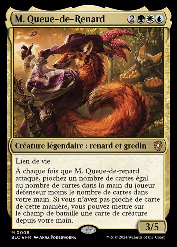 | Rules | Lifelink Whenever Mr. Foxglove attacks, draw cards equal to the number of cards in defending player's hand minus the number of cards in your hand. If you didn't draw cards this way, you may put a creature card from your hand onto the battlefield. |