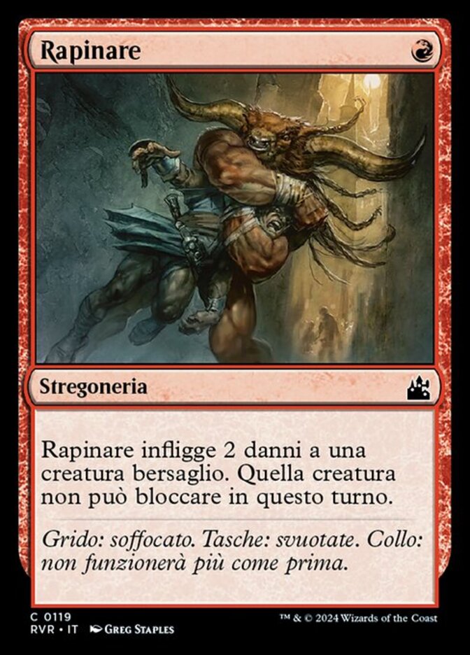| Rules | Mugging deals 2 damage to target creature. That creature can't block this turn. |